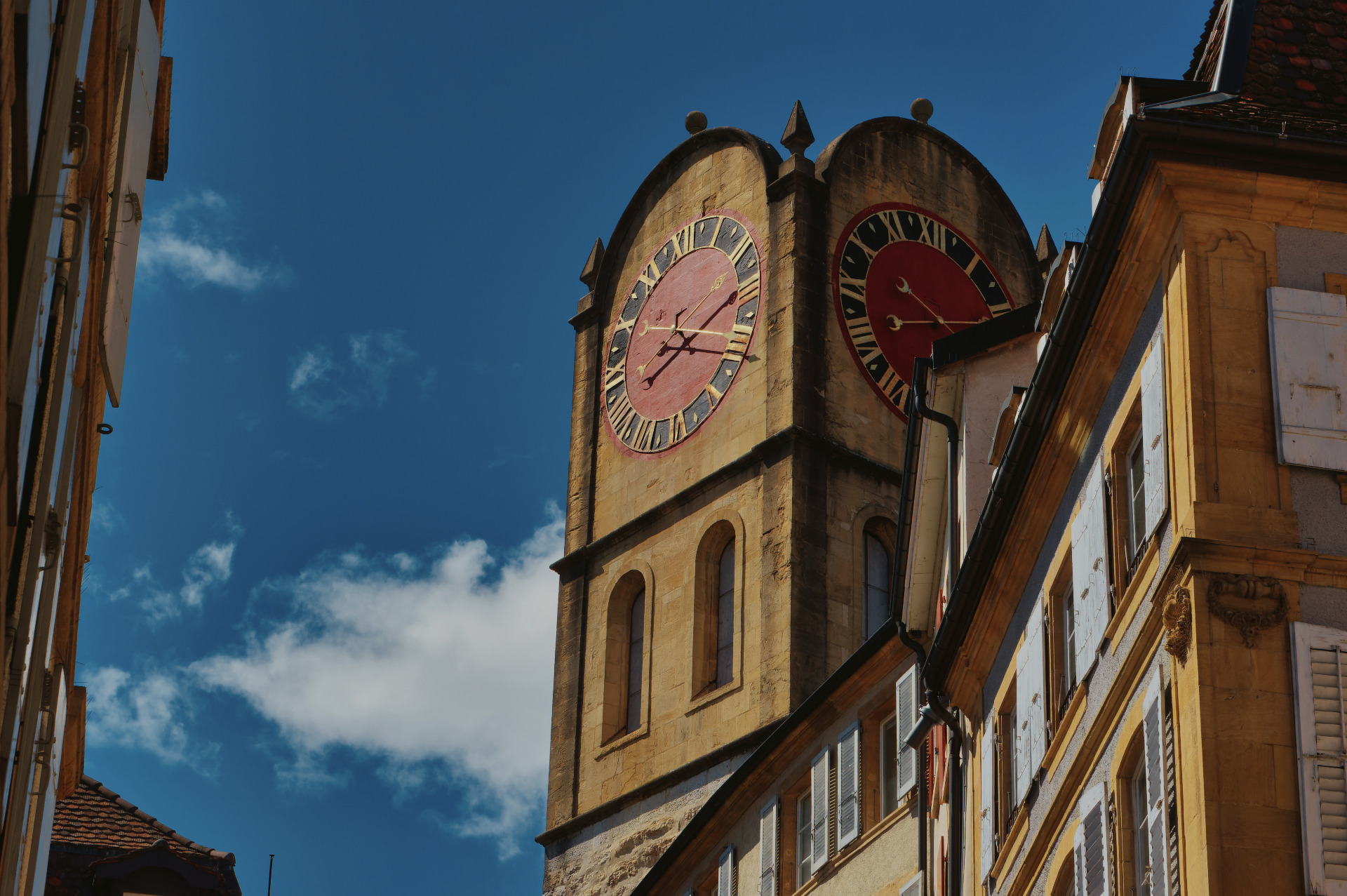 Dieses Foto ist in Neuchâtel (auf Deutsch Neuenburg) entstanden. Es zeigt den Neuenburger Kirchenturm, der mit seiner gelben Sandsteinfassade charakteristisch für die Stadt Neuenburg ist.